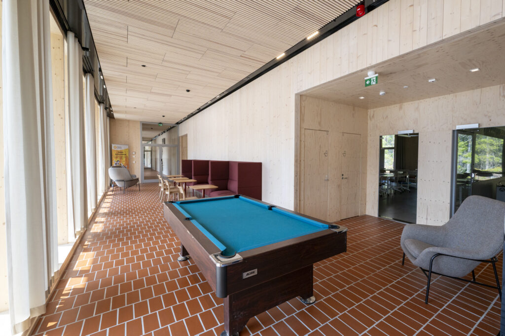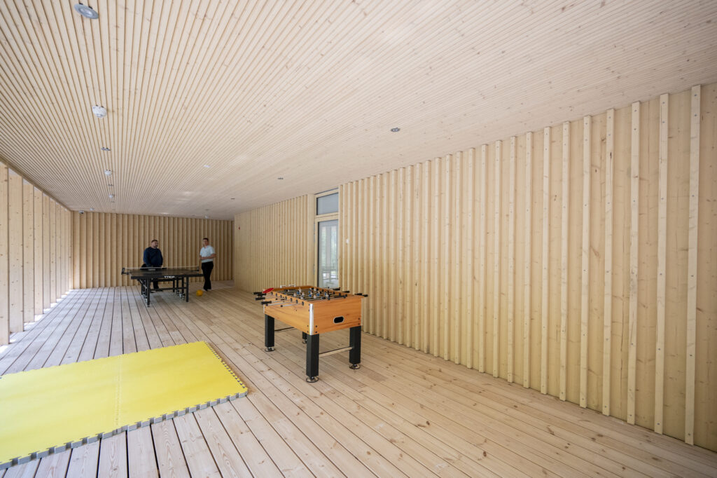 När vi stiger in doftar det nytt och trä. Det är ljust, fräscht och högt till tak. I en lounge finns ett biljardbord och soffgrupper. Alldeles intill ligger en liten musikstudio och en gymnastiksal med en klättervägg, träväggar, välvt tak och stora fönster som vetter ut mot skogen. De små klassrummen är som vilka klassrum som helst, kanske något mindre och trevligare än i många andra skolor. En detalj sticker dock ut. Klassrummen har två utgångar, vilket i regel gäller alla utrymmen. Det är av säkerhetsskäl.
