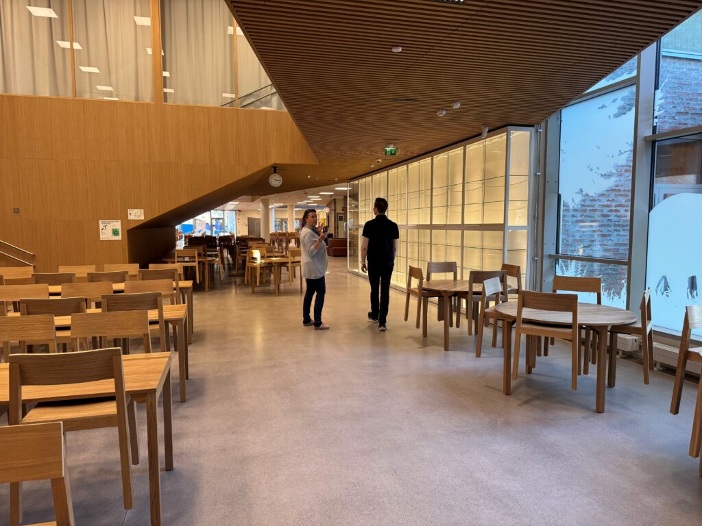Vi avslutar rundvandringen i skolans matsal. Idag är det knäpptyst. Men här ska dagligen serveras över 1200 matportioner. Hur mycket stiger ljudnivån månne, funderar rektorerna. De hastar vidare, för ännu måste ett infobrev bli klart denna fredag eftermiddag.