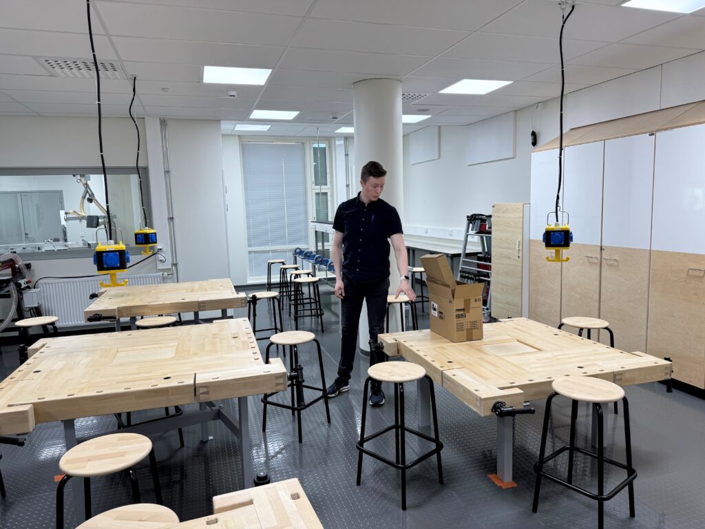 Fina utrymmen kan man i alla fall se fram emot. Skolan är modern, ljus och luftig. Tommy, som tidigare har haft rätt mycket slöjdtimmar, uppskattar hantverkarnas jobb.
