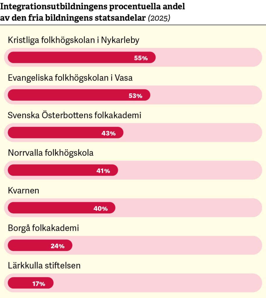 Men etter värre är det för Kristliga folkhögskolan i Nykarleby (Kredu) och Evangeliska folkhögskolan i Vasa. Där utgör de statsandelar som man får för integrationsutbildning över 50 procent av intäkterna.